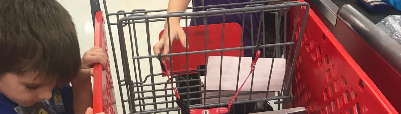 Take your time and talk with them as much as you can. Point out the lights, the signs, the letters and numbers. Talk about the colors in the store. If they’re older, point out the prices of things. Have them tell you which things are more or less expensive. Say “hi” to other shoppers. Teach them how to say “excuse me” when they pass someone. Teach them to hold the door for others. Have them hold your list or be “responsible” for the coats. When my kids were babies, I wore them in a baby carrier. Shopping meant snuggling time. Keep younger kids in the cart if you can. I always broke all the rules and put my younger kids in the basket part. Then piled all the shopping on top of them (gently and making sure they were safe of course). They loved it. It made it easy for me to talk with them and they enjoyed inspecting all the things I put in the cart as they came. Don’t ask them if they want to go in the cart, just establish that that’s where they go when they go shopping. But give them a break once you reach the end of your trip so they can explore. Eventually they’ll grow out of being content in the cart. Teach them to hold on to the cart as you walk. They won’t remember to do it constantly, but gently remind them to when you walk from section to section.